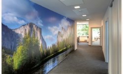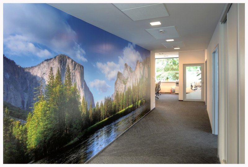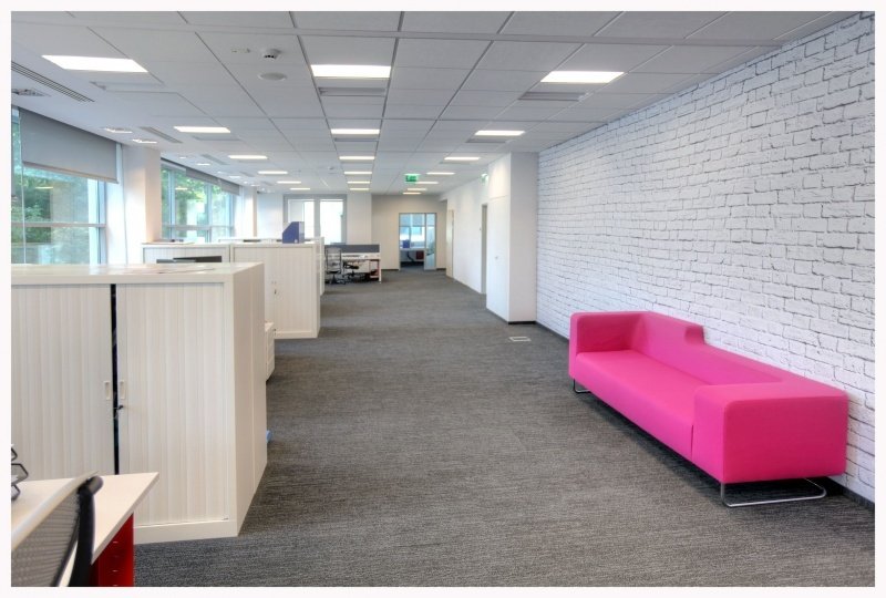 - 4. Kolorystyka - nadal dominują stonowane kolory ścian, ale najemcy powierzchni biurowej są coraz bardziej otwarci na niestandardowe rozwiązania. W budynkach z cegły ciekawym pomysłem jest pozostawienie jednej ściany surowej, nieotynkowanej. Ściany z bielonej cegły stosuje się także w nowoczesnych biurowcach. Innym oryginalnym rozwiązaniem jest dekorowanie ścian graffiti, na przykład motywami nawiązującymi do sztuki ludowej lub fototapetami, które mają związek z działalnością firmy. Panoramiczne zdjęcia potęgują wrażenie przestronności lub optycznie powiększają mniejsze pomieszczenia.