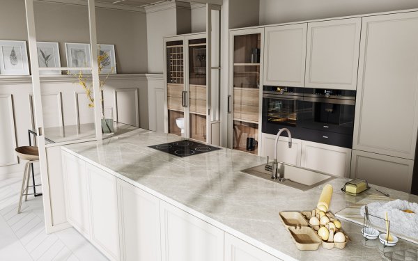 Tradycyjna stolarka frontów harmonizuje z subtelną kremową bielą, która wprowadza atmosferę przytulności, jednocześnie optycznie powiększając przestrzeń. Centralnym punktem jest rozległa wyspa, odgrywająca zarówno rolę miejsca do gotowania, jak i przygotowywania posiłków. Jednokomorowy zlewozmywak MEZZO II doskonale współgra z designerską baterią ZUMBA o elastycznej beżowej wylewce. Jej dopracowany, ergonomiczny kształt gwarantuje swobodne manewrowanie strumieniem, a imponujący zasięg ułatwia codzienne czynności. W tle widoczne są przesuwne drzwi, częściowo ukryte w zabudowie. Pozwalają na użytkowe oddzielenie strefy jadalnianej ozdobionej sztukaterią, kasetonami i obrazkami stojącymi na lamperii.