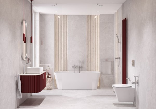Bardziej klasyczne podejście prezentują chromowane, połyskujące powierzchnie odbijające światło, potęgując wrażenie czystości i elegancji. Wanna, ustawiona centralnie, na zaakcentowanej symetrycznie ścianie, współgra z subtelną linią ściennego modelu wyróżniającego się płaskim, wygodnym uchwytem. Bordowe akcenty przyciągają wzrok, ubogacając kolorystycznie wnętrze.