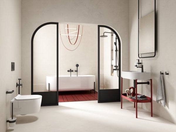 NOSTRIS to kompletna propozycja dla miłośników minimalizmu i ponadczasowych rozwiązań. Ciemna armatura to wyrazisty, graficzny akcent na tle jasnych powierzchni. Matowa czerń podkreśla plastyczne kształty komponentów i nadaje wnętrzu zdecydowany charakter. Scenograficzna strefa kąpielowa jest wyraźnie wydzielona zarówno kolorystycznie, jak i przestrzennie.