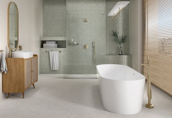 Zupełnie inny klimat wprowadza miękkie, szczotkowane złoto, ocieplające aranżację utrzymaną w duchu retro. Rattan i lastryko doskonale komponują się ze zgaszoną zielenią. Wolnostojący model staje się rzeźbiarskim akcentem, o wyważonej geometrii, podkreślając centralną pozycję wanny. Świetnie dobranym dopełnieniem serii mogą być akcesoria SMILE BA.