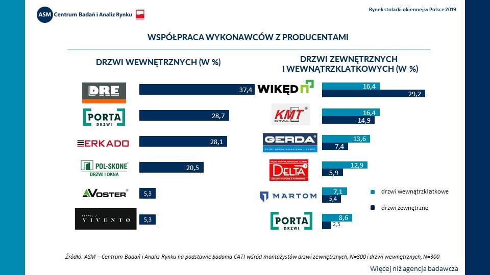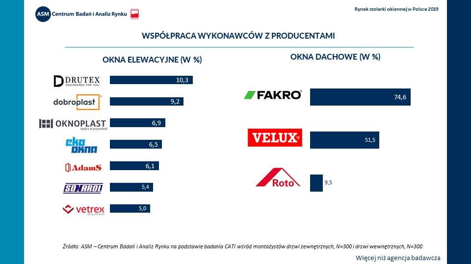 Współpraca producentów z wykonawcami wciąż zwiększa ich siłę w walce o klientów ostatecznych. Jak pokazują wyniki badania wskaźniki kooperacji wykonawców z producentami okien dachowych pozostają na wysokim poziomie. Świadczy to o silnym przywiązaniu do marki, która oferuje respondentom adekwatne do ich potrzeb wsparcie. Z kolei, rynek okien elewacyjnych charakteryzuje się dużym rozdrobnieniem i wysoką aktywnością producentów w zakresie współdziałania z wykonawcami.