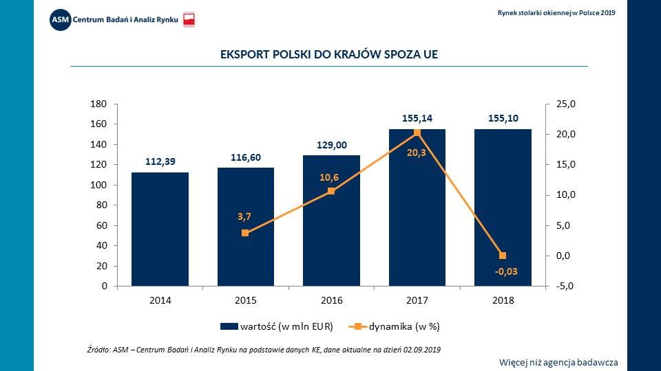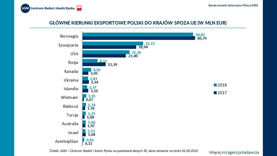 Prezentowane wyniki oraz ogólna sytuacja w Europie są mocnymi sygnałami dla polskich producentów z branży stolarki otworowej. Powinny wzbudzić kreatywność w działaniu, tak aby znaleźć rozwiązania, które zapewnią im oderwanie się od słabnących wyników europejskich i wytyczenie nowej, własnej ścieżki, aby nadal budować potęgę polskiej branży. Takim rozwiązaniem może okazać się patrzenie dalej niż granice Unii Europejskiej. Kraje spoza UE to nadal duża egzotyka jeżeli chodzi o kierunki eksportu polskiej stolarki budowlanej. W 2018 r. do krajów spoza UE trafiły produkty stolarki otworowej z Polski o łącznej wartości 155,1 mln EUR, co stanowi bardzo niewielki procent w stosunku do wartości 1 950,8 mln EUR tego co wyeksportowano do krajów UE.