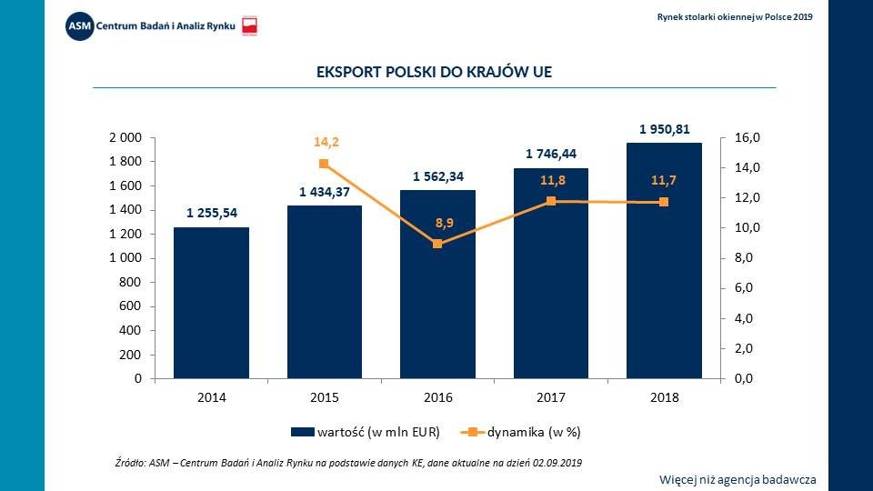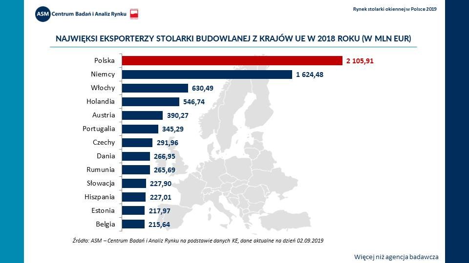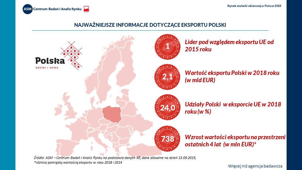 Dzięki bardzo mocnemu eksportowi, który ciągle rośnie dla polskich producentów, europejskie spowolnienie rynku jeszcze tak bardzo nas nie dotyka. Polska nadal jest największym eksporterem okien i drzwi w Europie. W 2018 roku wyeksportowaliśmy okna i drzwi za ponad 2,1 mld EUR, a więc o 10,7% więcej niż w roku 2017. Potwierdzeniem doskonałej kondycji polskiego eksportu jest również fakt, iż ilościowo stanowi on 46,3% w łącznej produkcji stolarki budowlanej w Polsce – Komentuje Beata Tomczak - Majewska z ASM - Centrum Badań i Analiz Rynku.