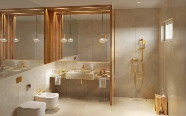 Gdy aranżacja łazienki ma szlif luksusu, na co dzień można się czuć wyjątkowo. Niezawodne do takich kreacji są baterie w złotym kolorze, np. kolekcja FIESTA BRIGHT GOLD, której koliste linie współtworzą wrażenie przytulności i prywatności. Warto zwrócić uwagę, że bateria bidetowa FIESTA BRIGHT GOLD ma podobny kształt jak umywalkowa. Różni się ruchomą końcówką wylewki, dzięki czemu można zmieniać kierunek strumienia. To praktyczna funkcja podczas korzystania z bidetu.