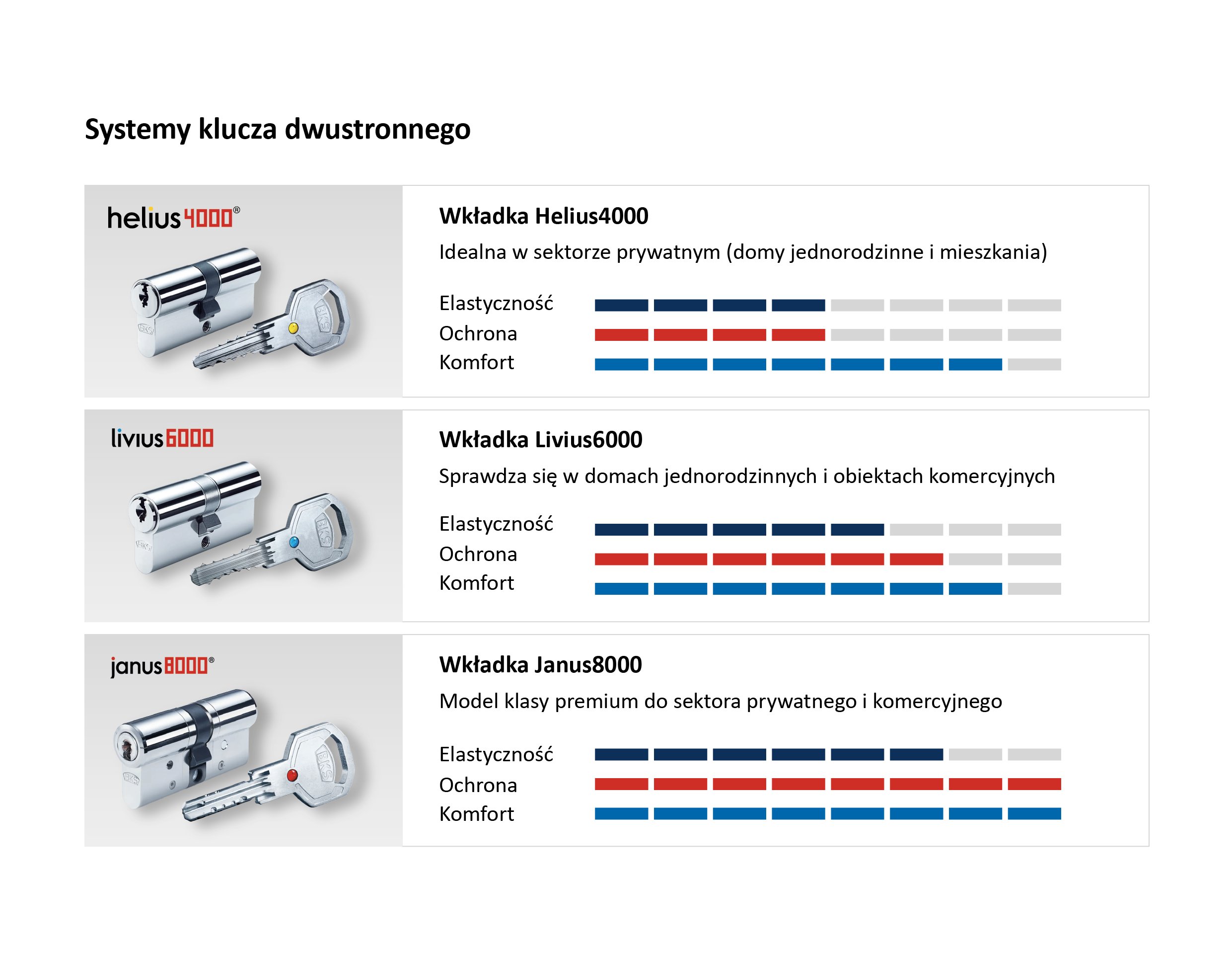 - systemy klucza dwustronnego – wygodna technika klucza dwustronnego gwarantuje szybkie wprowadzanie klucza do wkładki (w każdej pozycji), nawet przy słabym oświetleniu; klucze do wkładek tego typu objęte są dodatkowym zabezpieczeniem przed nieuprawnionym dorabianiem (karta bezpieczeństwa).