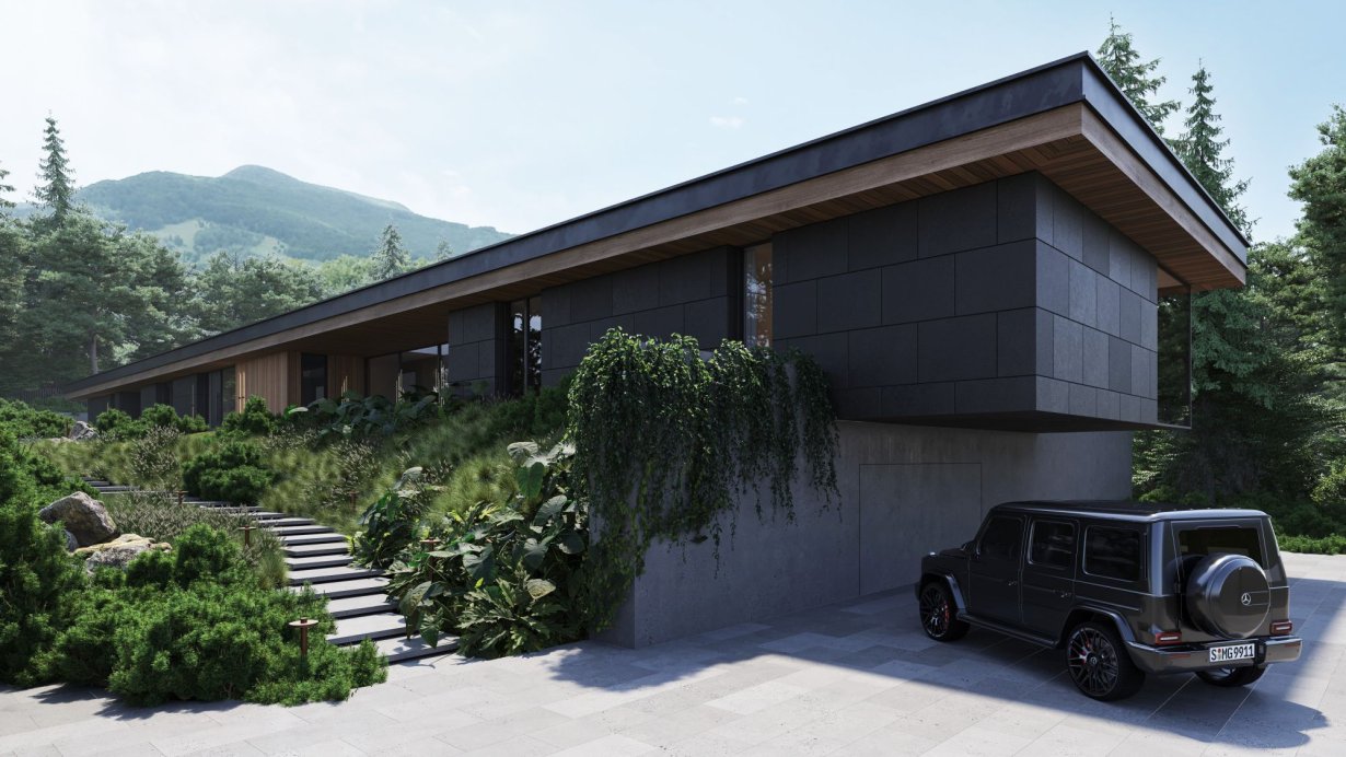 Bryła budynku przyjmuje kształt litery „T”, z dłuższym skrzydłem biegnącym równolegle do stoku. Część dzienna – usytuowana w skrzydle prostopadłym – została doświetlona z trzech stron, co zapewnia jasne, przestronne wnętrza. Salon, jadalnia i kuchnia płynnie łączą się z kaskadowym tarasem i basenem, tworząc spójną strefę dzienną otwartą na krajobraz.