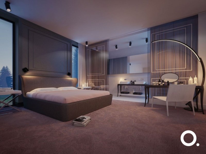 Wnętrze budynku dzieli się na 3 strefy funkcjonalne: wejściową, centralno-dzienną i nocno-sypialnianą. W strefie wejściowej znajduje się hall połączony z przestronną kuchnią oraz wc, garderobą i wejściem do garażu. Centralna część domu to strefa dzienna z salonem i jadalnią. Jest to pomieszczenie przez które przebiega komunikacja do wszystkich jego części i ogrodu. Do sypialni i przynależnej do niej łazienki, prowadzi dodatkowe przejście przez gabinet. Pomiędzy sypialnią a pokojami, które są na przeciwko, znajduje się łazienka główna.