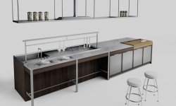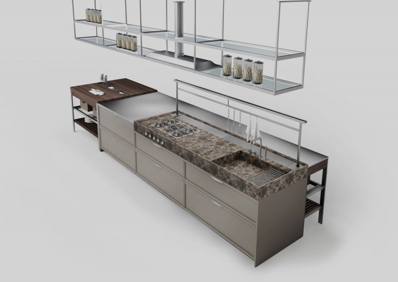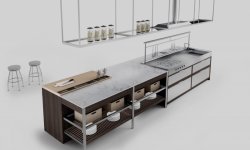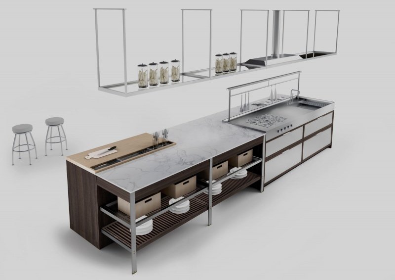 Konstrukcję tworzy stalowa rama, której podziały wypełniają szafki, szuflady i otwarte półki. Ich układ może być dowolnie konfigurowany przez użytkownika. Cechą charakterystyczną tej kuchni są naprzemienne otwarte i zamknięte przestrzenie. Monolityczna strefa zmywania i gotowania, wykonana jest z tego samego tworzywa przypominającego kamień. Na blacie pojawia się element z dębu postarzanego. Wyspa wyposażona jest w zainstalowany na stałe lub wysuwany półwysep.