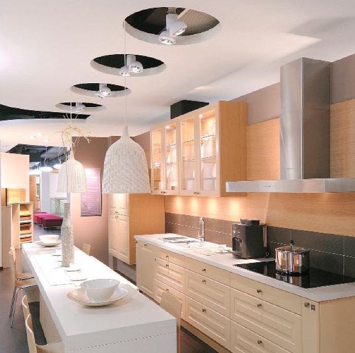 Podczas wyboru aranżacji równie ważnym zagadnieniem jest kompozycja świetlna. Podwieszane konstrukcje pozwalają na zastąpienie tradycyjnych żyrandoli i plafonów, oprawami umieszczonymi bezpośrednio w suficie. W zależności od funkcji pomieszczenia i pożądanego efektu dekoracyjnego możemy zastosować lampy halogenowe w postaci oczek lub świetlówki liniowe, z kolei węże świetlne i taśmy LED to ciekawe rozwiązanie na podświetlenie gzymsów. Warto zróżnicować oświetlenie w pomieszczeniach zapewniając intensywne, punktowe światło w strefie pracy, a rozproszone i przygaszone w miejscu odpoczynku. Należy także pamiętać o rozmieszczeniu poszczególnych punktów w ten sposób, aby nie powstały zacienione miejsca, a jednocześnie nadmierna liczba źródeł nie generowała niepotrzebnych strat energii. Umiejętne operowanie światłem w pomieszczeniu to także sposób na poprawienie jego proporcji. Wybierając bardzo jasne oświetlenie sufitowe optycznie podwyższymy pomieszczenie. Z kolei niewielkie wnętrze zyska na przestronności jeśli zamontujemy w nim wiele rozproszonych punktów.