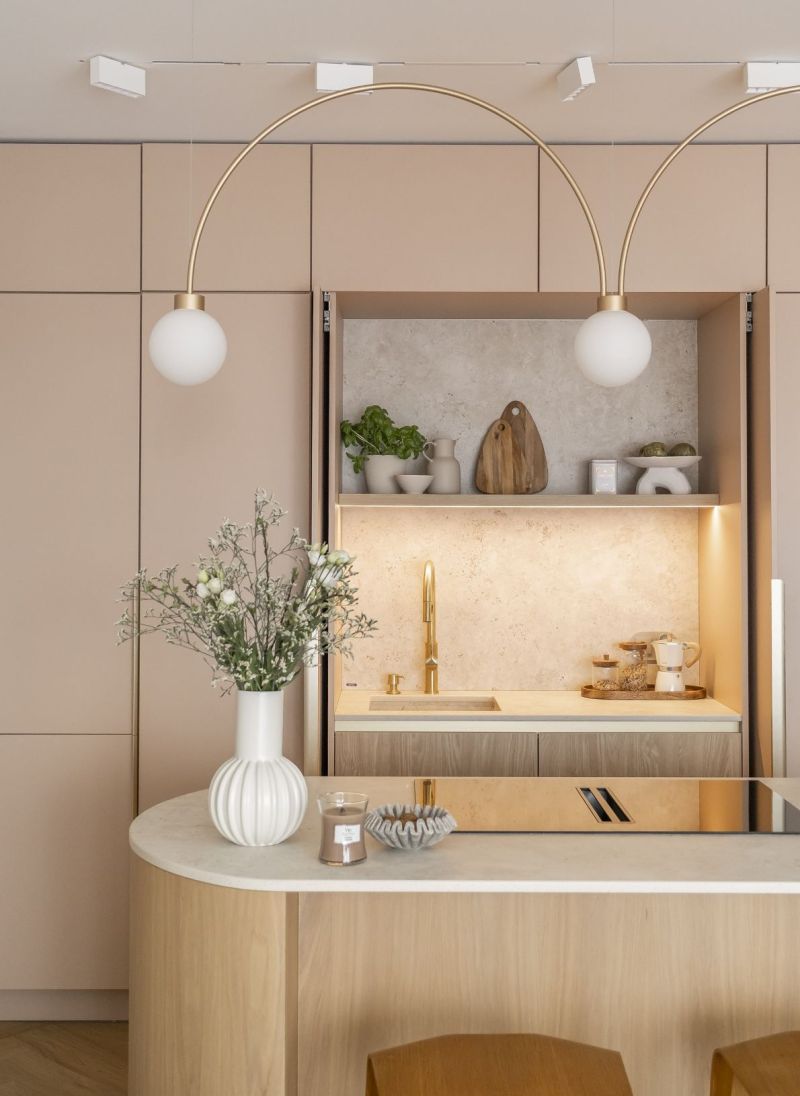 Funkcjonalność idzie tu w parze z estetyką – od pudrowych frontów po detale z litego dębu. Uwagę zwracają również wysokiej jakości materiały – jak blat z Dektonu, który sprawdza się zarówno wizualnie, jak i użytkowo.