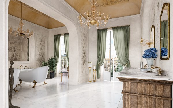 Salon kąpielowy zlokalizowany na piętrze budynku z widokiem na miejską panoramę to przestrzeń o wyjątkowym klimacie, w której klasyka spotyka się z wysmakowanym detalem. Beżowe ściany ze sztukaterią i lekkie zasłony w odcieniu szałwii subtelnie ocieplają wnętrze, współgrając z marmurem i drewnem. Łukowe otwarcie oddziela strefę z dwiema wolnostojącymi wannami na lwich łapach, którym towarzyszy czteroelementowa armatura LACRIMA w wykończeniu old bronze. Krzyżowe uchwyty oraz zaokrąglone linie przywołują ducha dawnych czasów, jednocześnie oferując nowoczesną funkcjonalność. Masywna szafka z wpuszczanymi umywalkami zawiera baterie z tej samej kolekcji, których odpowiednio wyprofilowane wylewki harmonizują z romantyczną stylistyką. Zwierciadła w złoconych ramach odbijają światło kryształowych kinkietów i żyrandoli, budując atmosferę wyciszenia i luksusu.