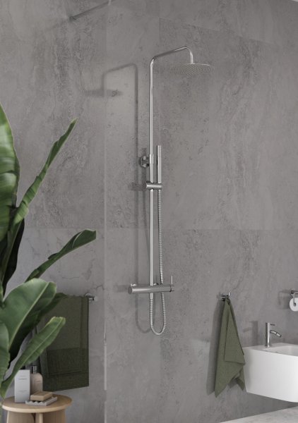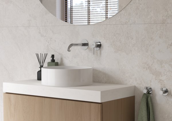 Wanna stojąca na postumencie posiada prosty, nowoczesny kształt. Dopełnia ją ścienna bateria wannowa CIRICULUS, składająca się z cylindrycznych form. Lśniące, chromowane wykończenie dodaje aranżacji lekkości i elegancji. Umieszczona została na zabudowie pełniącej funkcję praktycznej półki z pachnącymi świeczkami. Ciepłe, ukryte oświetlenie dodatkowo buduje nastrój, wzmacniając wrażenie domowego spa.