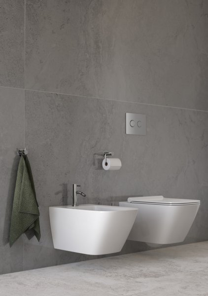 Natrysk oraz wiszące misy WC i bidetu umieszczone są na jednej płaszczyźnie, zachowując analogiczną zasadę projektową. Kabina walk-in jest otwarta i niemalże transparentna, dzięki zastosowaniu szklanej tafli bez ramy. Zestaw natryskowy CIRICULUS z płaską deszczownią i smukłymi proporcjami bazuje na geometrycznych liniach, których chromowana powierzchnia podkreśla techniczną precyzję formy, równie świetnie współgrając z chłodniejszym odcieniem kafli. Model bidetowy z tej samej serii i akcesoria SMILE, takie jak uchwyt na papier toaletowy oraz dodatkowe wieszaki, uzupełniają przestrzeń, nie konkurując z głównymi bryłami wyposażenia. Dzięki temu strefa sanitarna pozostaje funkcjonalna, estetyczna i w pełni zintegrowana z całą koncepcją, gdzie prostota idzie w parze z przemyślanym detalem i wysoką jakością wykonania.