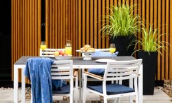 Proste wzornictwo i wysoki komfort są również znakami rozpoznawczym zestawów jadalnianych Laura i Sara. Wykonane z malowanego na biało aluminium meble, dzięki prostej formie doskonale komponują się z przestrzenią ogrodu lub tarasu. Dzięki nim możemy stworzyć na zewnątrz domu letnią jadalnię. Premierowe kolekcje Miloo inspirują do przeniesienia ośrodka codziennego życia do ogrodu lub na taras, aby tam cieszyć się beztroskim relaksem w letnie dni.