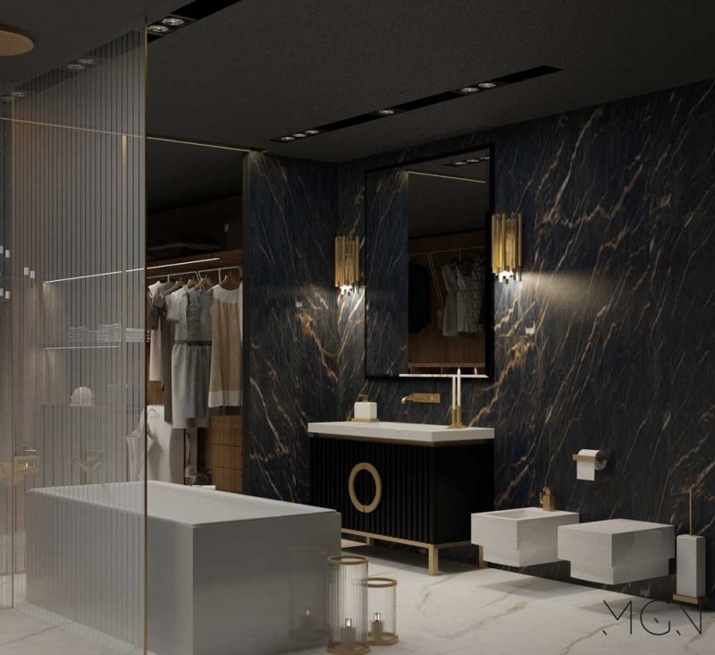 [[[zdjecie,13986,duze]]] Foto.3. Jasne drewno i płyta MDF lakierowana na ciemny grafit będą królować w kuchniach w tym sezonie. W prezentowanym projekcie przewidziano także inne modne materiały - złoto i marmur (lampy i obudowa kominka). Taki wystrój nie zestarzeje się przez lata!