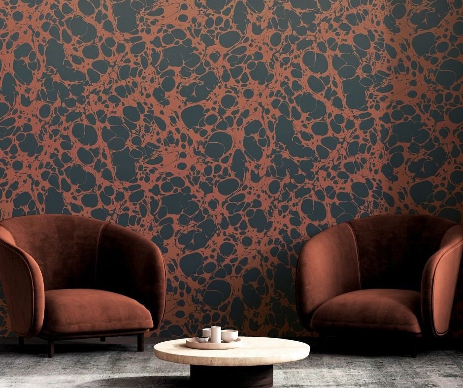 LAVA, to jedna z ulubionych tapet projektantów, ceniona za oryginalny wzór typu „olej na wodzie”, głębię połysku oraz subtelną tłoczoną fakturę powierzchni. Nowe kolory, które dołączyły do oferty - ciepłe taupe, biel ze złotymi refleksami, głęboki atramentowy błękit na tle luksusowej miedzi – wzbogaciły fascynującą gamę kolorystyczną tej linii.