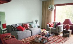 Pattern-mixing może też przybrać zupełnie swobodną postać. Salon w nowoczesnym stylu, w którym rządzą wygodne sofy w szarości i czerwieni nabiera nietuzinkowej dynamiki dzięki ścianom w zieleni Pixie z palety Beckers Designer Collection i zróżnicowanym deseniom dodatków. Włochaty dywan w beżowo-czerwoną kratę stanowi przytulną ozdobę pomieszczenia, a kraty, pasy i kwiatowe wzory na tekstyliach ożywiają wnętrze, nie pozbawiając go jednak rozleniwiającej, stonowanej atmosfery.