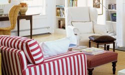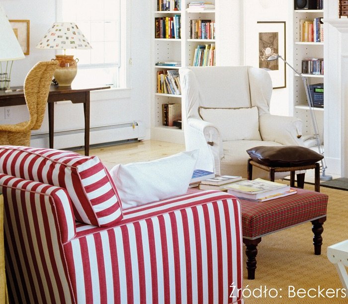 Pattern-mixing może z powodzeniem zaistnieć w konserwatywnym salonie. Wygodny fotel w wyraziste czerwono-białe pasy w otoczeniu białych regałów i ścian pomalowanych delikatną szarością Tender z palety Beckers Designer Colour staje się głównym bohaterem aranżacji. Ekstrawagancko zestawiony z podnóżkiem w szkocką kratę tworzy nieszablonowe przełamanie klasycznego wystroju. Abażur z kolorowym nadrukiem i żakardowe wzory w miodowym odcieniu na krześle czy dywanie dodatkowo rozweselają jasną bazę, nie wnosząc przy tym dekoracyjnego chaosu.