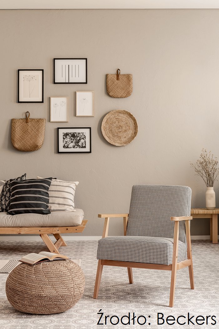Barwy ziemi i naturalne materiały również świetnie odnajdują się w trendzie pattern-mixing, który nie musi wyrażać się w mocnych akcentach. Wnętrze urządzone w palecie beżów zyskuje urozmaicony charakter dzięki zestawieniu różnych faktur: od plecionek, przez drewniane meble po wielość faktur tekstyliów. Czarno-białe dodatki, jak pepitka na obiciu fotela retro, różnorodne printy na poduszkach czy grafiki na ścianach przesuwają stylistykę wnętrza w kierunku swobodnej elegancji. Ściany pomalowane kolorem Macadamia z palety Beckers Designer Colour tworzą neutralne tło, które podkreśla spójność aranżacji.