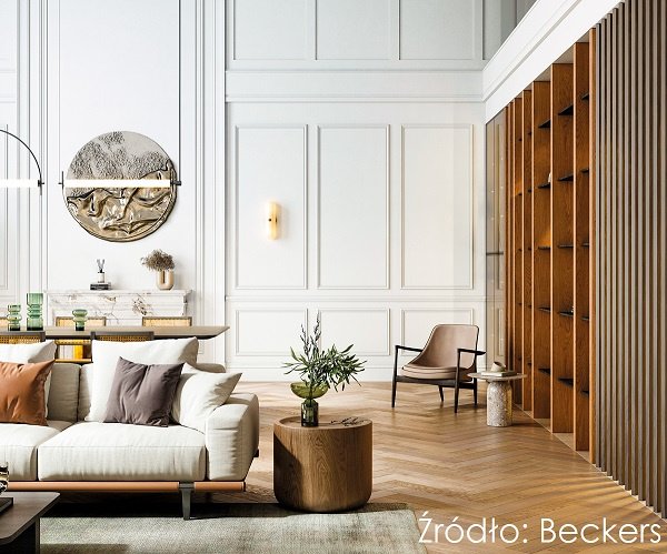 Wyeksponowanie przestrzeni ułatwiają wnętrza, które charakteryzuje nie tylko rozległość, ale i imponująca wysokość. Poczucie to dodatkowo potęgują ściany w bieli Beckers Designer White, a ozdobne listwy sztukateryjne pociągnięte aż pod sufit wzmacniają wrażenie strzelistości. Klasyczna jodła na podłodze, drewno w formie ściennych lameli i w nowoczesnych bryłach mebli sprawiają, że wnętrze wytraca monumentalność i zyskuje wizualne ciepło. Eleganckie detale ze szkła i metalu oraz meble wypoczynkowe o przytulnych tkaninach eksponują komfort i funkcjonalność salonu.