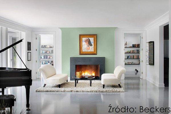 Sposobem na wydobycie przestronności w salonie jest otwarcie go na inne pomieszczenia. W zatopionym w bieli wnętrzu ścianka działowa udekorowana szałwiową zielenią Sage z palety Beckers Designer Colour stanowi subtelny, ale wyrazisty akcent jako wizualna rama eksponująca kominek. Dostojność czarnego fortepianu oraz spokojna elegancja mebli wypoczynkowych podkreślają zamiłowanie domowników do klasyki zarówno w muzyce, jak i wzornictwie. Szara podłoga z żywicy tworzy nowoczesny akcent, która odbija światło i dodaje aranżacji wielowymiarowości.