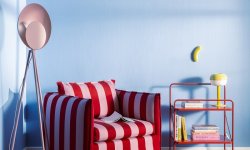 Z użyciem palety Tikkurila Expressive można też wykreować niecodzienne wnętrze, nadając barwom graficzną formę. Ściany w błękicie J356 Sky farb Tikkurila Optiva stworzą wyraziste, ale wyciszające tło dla dominującego fotela w czerwono-różowe pasy oraz kolorowego dywanu z geometrycznym wzorem w odcieniach fioletu, żółtego i bordo. Designerska lampa w pudrowym różu i prosty metalowy stolik pomalowany emalią Tikkurila Everal Aqua w czerwieni M316 Tomato wzmocnią zabawę kontrastami i proporcjami, składając się na wesołą przestrzeń z nutą ekstrawagancji.