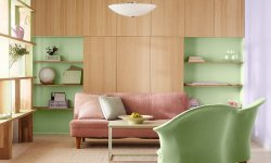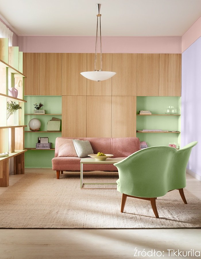 Trend Tikkurila Expressive ma też wysublimowane oblicze, w którym kolorystyczne wybuchy emocji oddają pola łagodniejszej grze kolorów. Wnętrze w pastelowych tonach Expressive emanuje spokojem, nie tracąc przy tym artystycznego ducha. Ściany pomalowane farbami Tikkurila Optiva w odcieniach fioletu X344 Minuet i różu Y411 Milkshake łączą się w odświeżającą kompozycję z zielenią X381 Aloe, którą pomalowane są wnęki i kolumny zabudowy meblowej. W połączeniu z jasnym drewnem i eleganckimi meblami w tonacjach palety Expressive tworzą bezpretensjonalną aranżację, w której kolorystyczna odwaga jest spokojnym manifestem stylu.