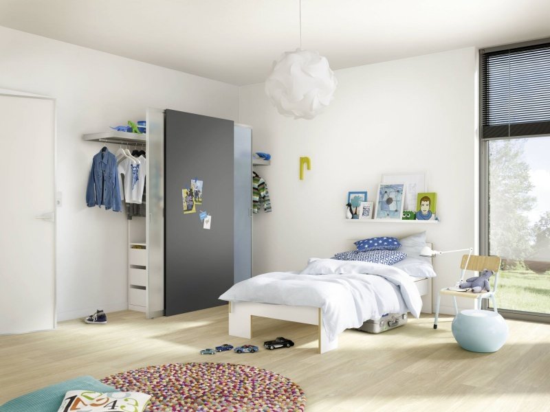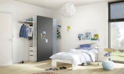 W pojemnej szafie zmieści się cała dziecięca garderoba, różnego rodzaju akcesoria oraz masa zabawek. Z kolei fronty szaf wykończone warstwą tablicową to przestrzeń na kreatywną zabawę. Na drzwiach zawiesić można też specjalne kieszenie na kredę i drobne zabawki. Fronty drzwi z naniesionym kolorowym wzorem, grafiką lub ulubionym zdjęciem dodatkowo ożywią aranżację pokoju.