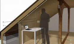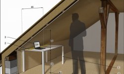 Jeżeli zależy nam na uzyskaniu pionowych przegród o wysokości umożliwiającej ich wykorzystanie - należy dobudować dodatkową ściankę działową równoległą do ścianki kolankowej. Jej wysokość będzie wynikać z odległości od ściany zewnętrznej. Warto ją rozważyć analizując na przykład ustawienie przy niej biurka. Na rysunku powyżej wariant „minimum”, czyli ścianka o wysokości 75cm.