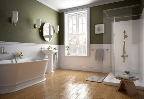 Ciepły parkiet i sztukateria odwołują się do historycznego ducha kamienicy. Klasyczna, biała ceramika na smukłym piedestale sprawia, że strefa umywalkowa prezentuje się lekko i elegancko. Okrągłe zwierciadło i symetryczne kinkiety nadają jej subtelny blask. Oliwkowe ściany z boazerią zakończoną dekoracyjną listwą tworzą wysmakowane tło dla armatury ANTICA utrzymanej w tonacji starego brązu. Charakterystyczna rączka natryskowa przypominająca słuchawkę telefoniczną i krzyżowe uchwyty podkreślają styl pomieszczenia. Dopracowane detale dodają wyrafinowania. Naturalne światło wpadające przez okno z tradycyjnymi szprosami wydobywa szlachetność zastosowanych materiałów i uwydatnia liczne dekoracyjne profilowania.