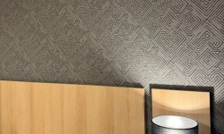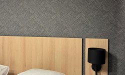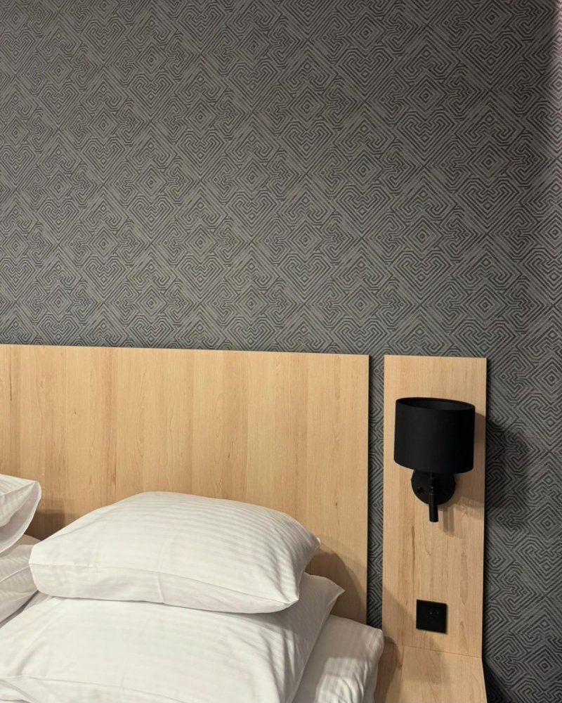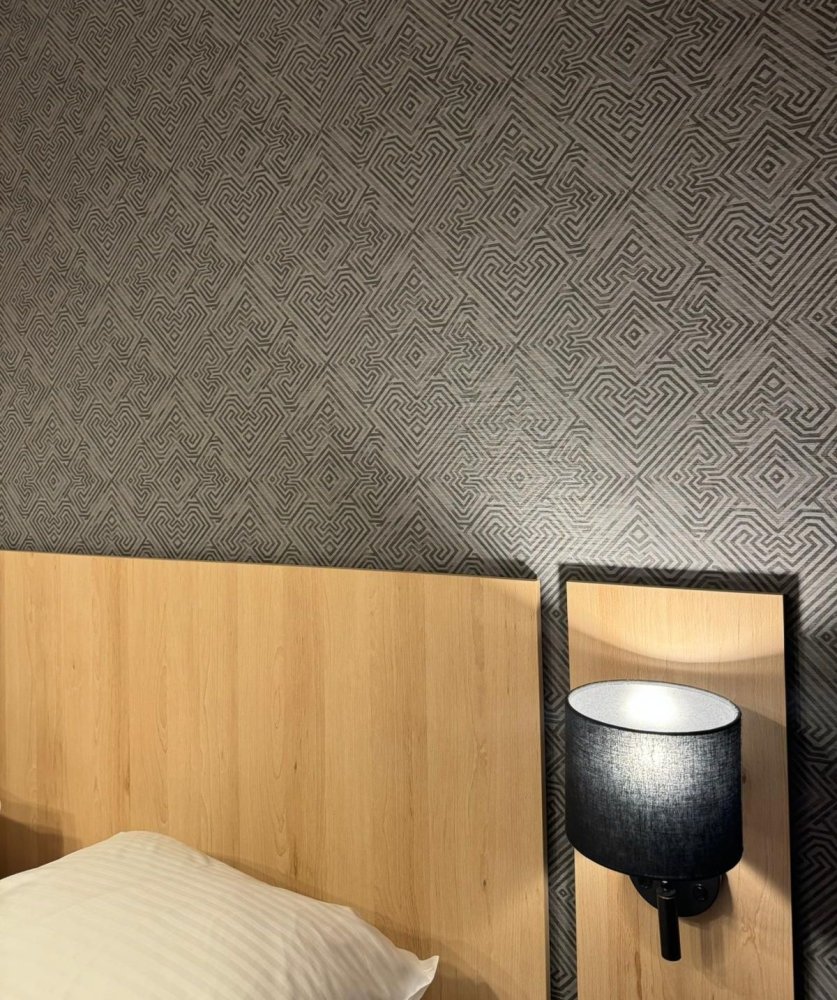 Ze światłem znakomicie współgrają również geometryczne wzory tapet, np. labiryntowa Astoria Cubica. Na zdjęciach z realizacji w hotelu Best Western Rzeszów widać wyraźnie różnicę – bez oświetlenia wzór tapety jest stonowany, natomiast w świetle nabiera głębi, kolory stają się intensywniejsze, a całość zyskuje nutę tajemniczości.