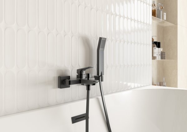 Część kąpielową zaprojektowano z myślą o relaksie i wyciszeniu. Wanna stanowi jej serce, przyciągając uwagę rzeźbiarską obudową. Towarzyszy jej ścienna bateria wannowa VITTO GUN METAL VERDELINE, której oszczędny design i geometryczna, wyważona linia stanowi przeciwwagę dla miękkich kształtów ceramiki oraz mebli, wzmacniając nowoczesny charakter całej aranżacji. Małe, strukturalne płytki pięknie pracują ze światłem, tworząc delikatne cienie i podkreślając rytm wnętrza. W odbiciu lustra widać prysznic wyposażony w baterię natryskową z tej samej serii, co pozwala zachować pełną konsekwencję stylistyczną. Szlachetna, przydymiona barwa armatury wprowadza wyrafinowany kontrast, jednocześnie nie zakłócając spokojnej atmosfery. Przemyślany układ, stonowane barwy i konsekwentnie dobrane produkty sprawiają, że łazienka staje się miejscem sprzyjającym regeneracji dla osób, które cenią świadome projektowanie, trwałe materiały i ponadczasowy styl.