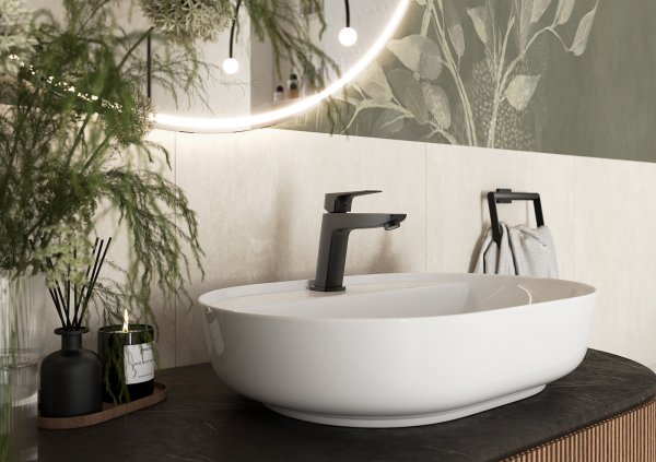 Strefa umywalkowa została zaplanowana jako reprezentacyjny fragment aranżacji. Centralnym punktem jest obszerna, nablatowa misa o łagodnym profilu, osadzona na blacie w ciemniejszym odcieniu, który wyraźnie odcina się od jasnych powierzchni ścian. Podwieszana szafka z ryflowanym frontem w ciepłym, drewnianym tonie wprowadza element przytulności, równoważąc chłodniejsze wykończenia. Stojąca bateria VITTO GUN METAL VERDELINE wyróżnia się dynamiczną sylwetką i precyzyjnie dopracowanymi detalami. Odcień powłoki gun metal pięknie reaguje na światło, nadając armaturze elegancję bez nadmiernego połysku. Jest bardzo trwała, powstała w technologii PVD, posiada powierzchnię, którą wyjątkowo łatwo utrzymać w czystości. W bezpośrednim sąsiedztwie znajduje się wieszak na ręcznik z kolekcji akcesoriów GRETA w matowej czerni, którego prosta, graficzna linia dyskretnie nawiązuje do wiszącej lampy i innych dodatków. Uzupełnieniem kompozycji jest podświetlane lustro, optycznie powiększające przestrzeń.