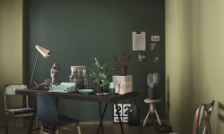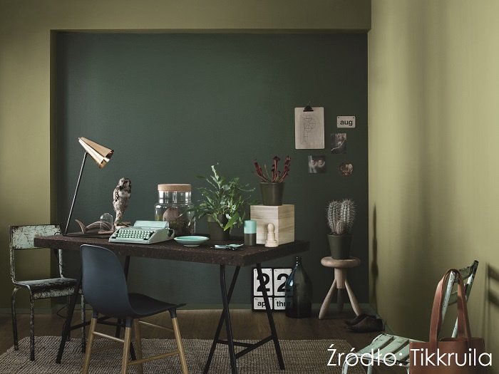 Wnętrze w dwutonie zieleni może stać się otulającą przestrzenią dla wielowymiarowej narracji bazującej na retro gadżetach, darzonych sentymentem pamiątkach, starych zdjęciach i bieżących notatkach. Wiele powiedzą meble czy przedmioty zgromadzone na biurku, a pomalowanie wnęki czy wydzielonego fragmentu ściany farbą magnetyczną Tikkurila Magnetic pozwoli uzyskać miejsce na rotacyjną galerię dzieł różnych, która może przyjmować większe lub mniejsze rozmiary i zmieniać swój charakter w zależności od nastroju i potrzeb domowników. Zaznaczona ciemną zielenią M442 Fjord z kolekcji Tikkurila Optiva doda zgromadzonym tam przedmiotom głębi w otoczeniu ścian o zdecydowanie jaśniejszym odcieniu S451 Arbour. Tak zaaranżowana przestrzeń, mimo że daleka od minimalizmu, nie epatuje nadmiarem przedmiotów i pozostaje elegancka w nieco melancholijny, a jednocześnie designerski sposób.