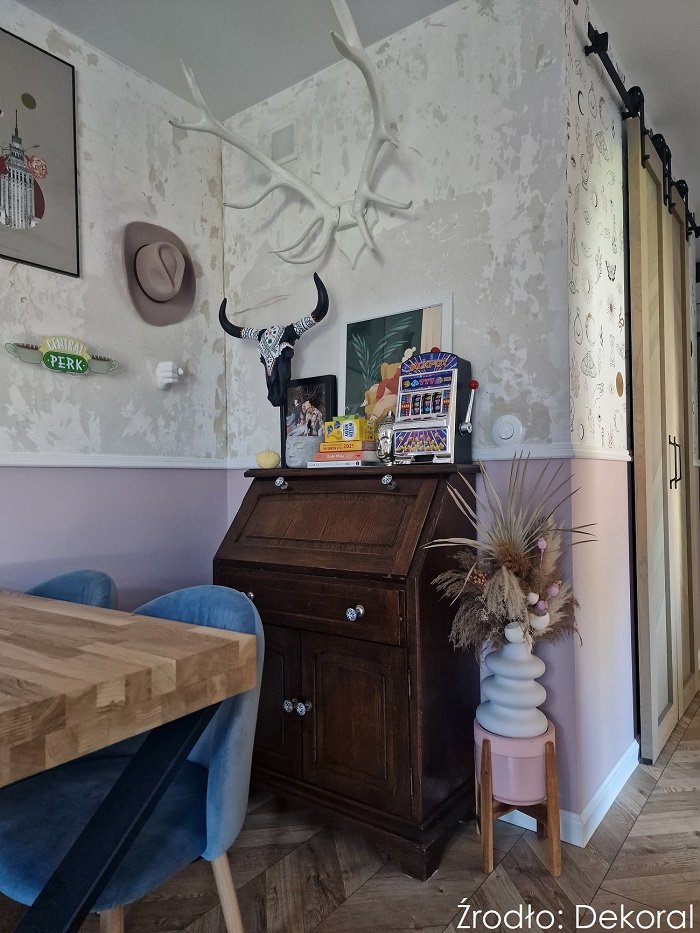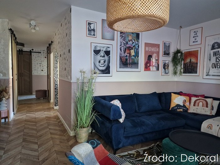 Przestrzeń przeznaczoną na ekspozycję zgromadzonych przez lata prywatnych dzieł sztuki można efektownie wydzielić za pomocą lamperii. Pomalowana odcieniem Różowy Pudrowy z palety Dekoral Effect 3in1 wystąpi w roli delikatnego echa, które nie przytłumi dekoracji i akcentów, świadczących o życiu pełnym pasji. Subtelnie podkreśli przy tym zawieszoną powyżej kolekcję plakatów i fotografii, tworząc także nietuzinkowe tło dla wyrazistej granatowej sofy. Będzie też stanowić wspólny mianownik dla wyeksponowanych na przeciwległej ścianie mebli po przodkach czy pamiątek z podróży. Całość złoży się na kolaż, w którym sztuka współczesna spotyka się z eksponatami z różnych okresów życia domowników. W ten sposób za pomocą przedmiotów z charakterem i przemyślanej kolorystyki ścian można bawić się konwencjami i stylami oraz układać je w spójną opowieść.