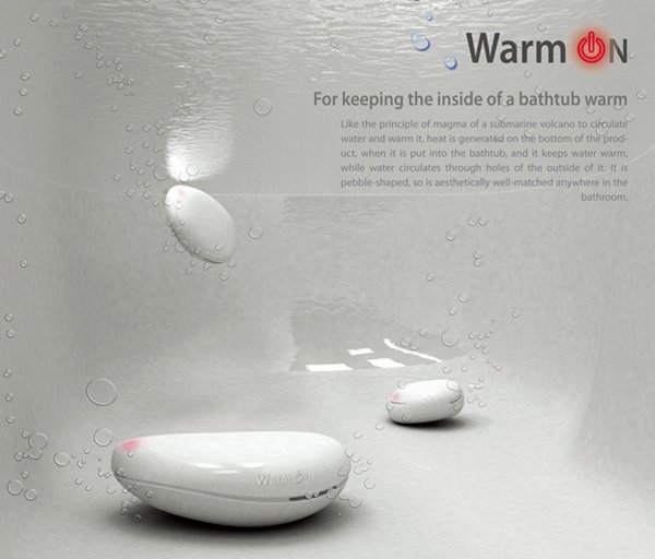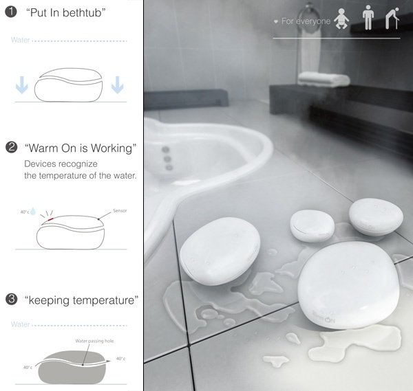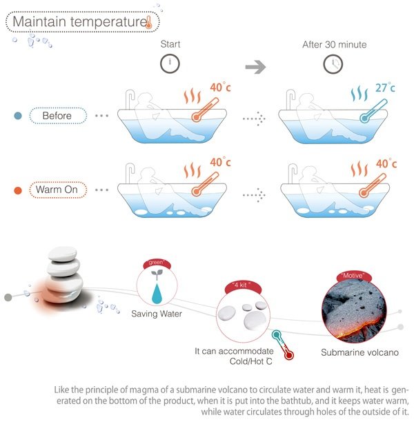 Projektanci próbują swoich sił we wszystkich dziedzinach życia. Projekty przyszłości, które może za kilka, kilkanaście lat będą w codziennym użytku. Produkty i rozwiązania, które będą ułatwiać nam życie i sprawiać drobne przyjemności ...również i w łazience. Sunmi Hwang, Hyunjoo-Lee i Jiwon-Seok zaprezentowali projekt kamieni, które sprawią, że woda w naszej wannie na długo zachowa wymarzoną przez nas temperaturę.