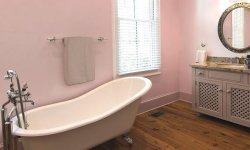 Pastelowy róż może być też głównym bohaterem dekoracyjnym łazienki, wprowadzając atmosferę nienachalnego luksusu. Odcień Y421 Orchid odpornej na grzyby pleśniowe i wielokrotne zmywanie farby Tikkurila Luja będzie harmonijnie współbrzmiał z drewnem i meblami w tonacjach ciemnego beżu. W zestawieniu z wolnostojącą wanną retro oraz lustrem w barokowej ramie z łatwością nawiąże do komfortu dawnych salonów kąpielowych.