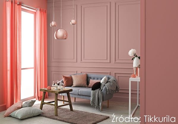Delikatny róż i sztukaterie to połączenie eleganckiego, klasycznego dekoru, z nowoczesnością. Ściany w stonowanym retro kolorze H417 Mezeron z kolekcji Tikkurila Optiva ozdobione listwami i panelami dekoracyjnymi kreują bazę pod wnętrze inspirowane palcową stylistyką, ale z dekoracyjnym biglem. Ważną rolę w tym przedsięwzięciu odgrywają nowoczesne akcenty, jak szara sofa czy lampy w złotym wykończeniu, które przełamują wystrój w kierunku współczesnej elegancji.