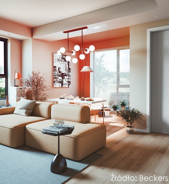 W nowoczesnych wnętrzach zgaszony róż zyskuje zupełnie inny charakter, wnosząc powiew pozytywnej energii. Ciepły odcień Pink z palety Beckers It’s Simple harmonijne współgra z meblami i podłogą w tonacji jasnego brązu, uwalniając swe beżowe tony w rozlewających się po pokoju promieniach słońca. Delikatne kolorystyczne odbicie następuje w zderzeniu różu z akcentami w tonacjach czerni i bieli, dodając wnętrzu dekoracyjnego uroku.