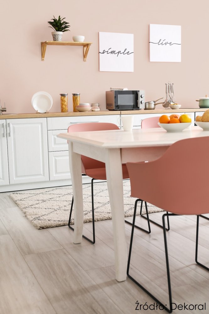 Różowy Brzoskwiniowy to sprawdzony przepis na przytulną kuchnię. Kolor ten pochodzący z palety multifunkcyjnej farby Dekoral Effect 3in1 z powodzeniem można zastosować także bezpośrednio nad blatami kuchennymi. Pozwalają na to właściwości farby, która jest odporna na plamy, wielokrotne zmywanie, działanie wody czy detergentów, a także grzyby pleśniowe. W otoczeniu bieli i jasnego drewna bez dużych nakładów stworzy ujmujące wnętrze, wypełniające serce domu optymizmem.