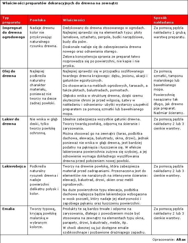 - [[[zdjecie,828,prawa]]] Jeśli już zabezpieczyliśmy deski impregnatem technicznym, możemy przystąpić do ich dekoracji lakierem, lakierobejcą, lazurą, emalią lub olejem. Wybór właściwego produktu jest kluczowy, jeśli chcemy utrzymać zdrowy wygląd drewna przez wiele lat. - Produktów ochronno-dekoracyjnych do stosowania na zewnątrz jest bardzo wiele, ale ważne jest aby dobrać odpowiedni rodzaj produktu do powierzchni, jaką chcemy pomalować - zwraca uwagę Andrzej Wójcik. - W przypadku dużych elementów bardzo istotna będzie na przykład elastyczność preparatu a w przypadku powierzchni poziomych odporność na ścieranie i łatwość odnawiania powłoki.